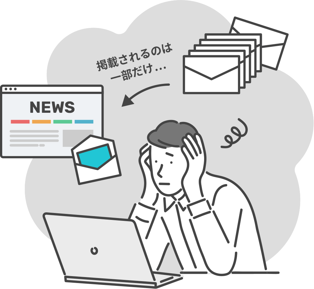 多くの企業では広報、個人ではマネージャーというメディア担当者を雇っています。担当者は、メディアに掲載されたい情報をプレスリリースとして、毎月何十通というメールやFAX、電話で各情報メディアに送ります。そのプレスリリースがメディアの目に止まって初めてメディアに取り上げられることになります。(=ニュースリリース)しかし取り上げられるのはほんの一部で、ほとんどの企業やサービス・個人が大手メディアに取り上げられることはありません。