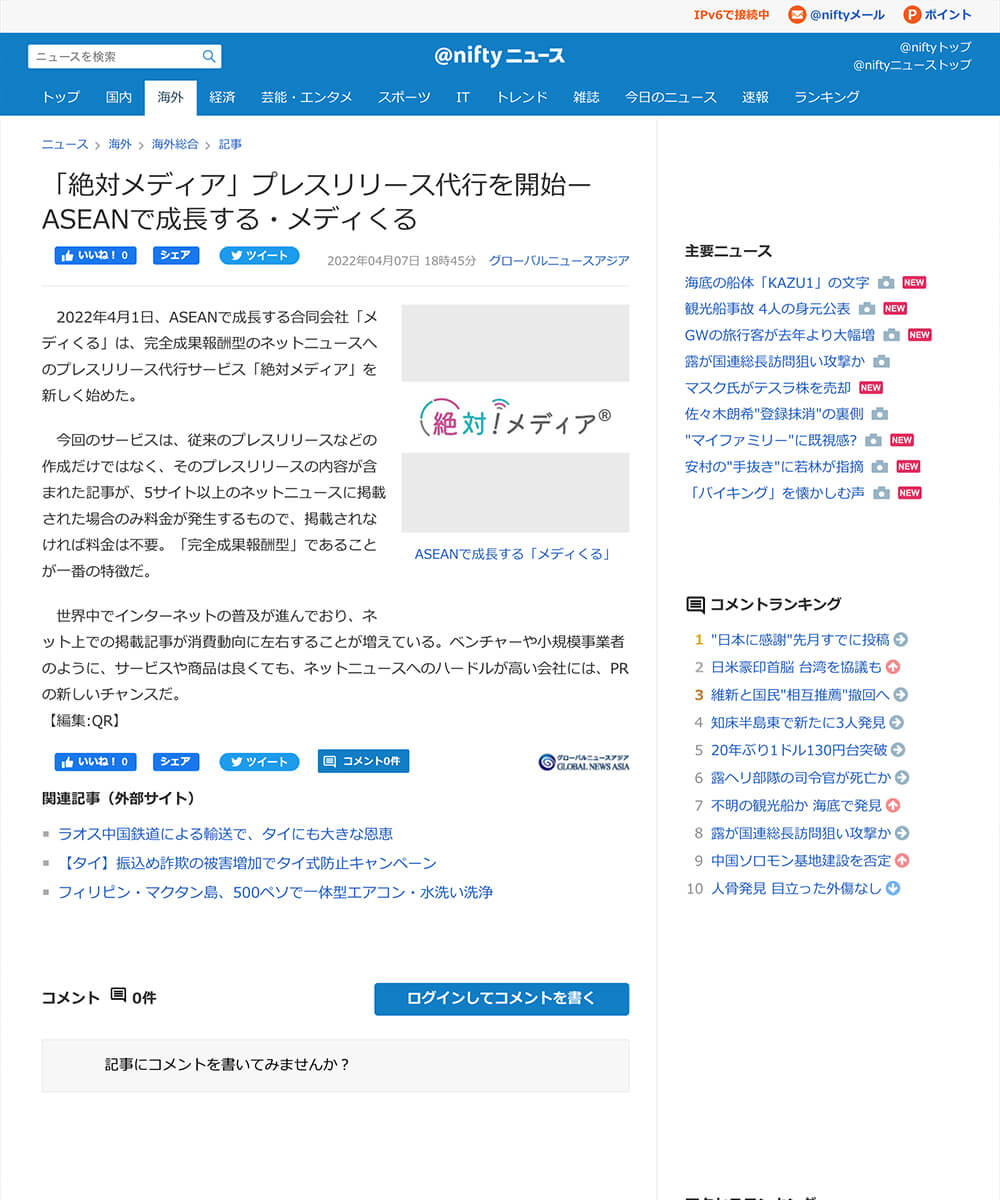 従来のプレスリリースのような自社発信ではなく、大手メディアから取り上げられた記事内容となります。